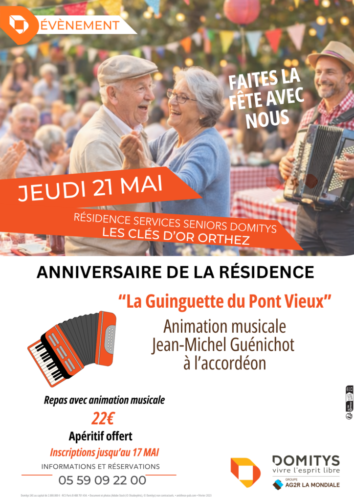 ANNIVERSAIRE DE LA RESIDENCE DOMITYS 21 MAI « GUINGUETTE DU PONT VIEUX » Les actus de la Citadine Publié le 29 avril 2026 Actualités AccueilActualités RENCONTRE AVEC LA CROIX ROUGE – ACTIONS & BENEVOLES Îles Canaries Récit de voyage Domitys Orthez